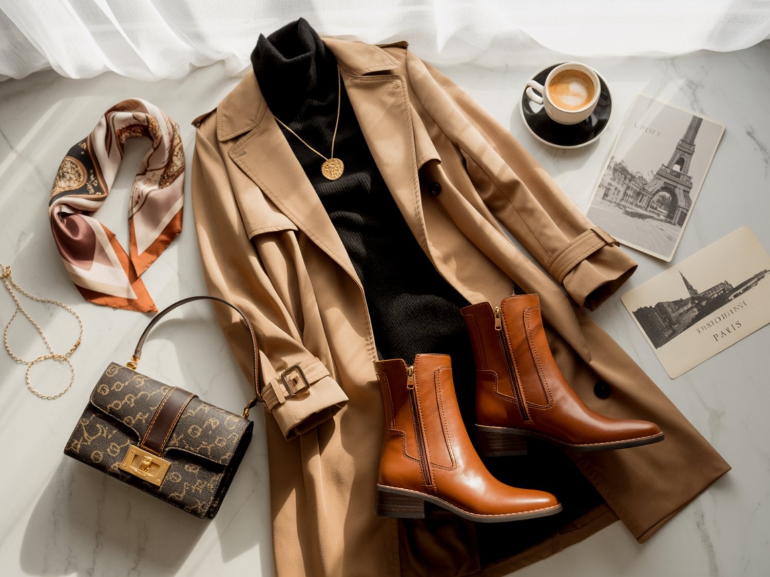 A camel coat with a burgundy scarf brings perfect warmth for chilly November mornings in Paris. Those black leather gloves add practical elegance while keeping your hands toasty during long café sessions.